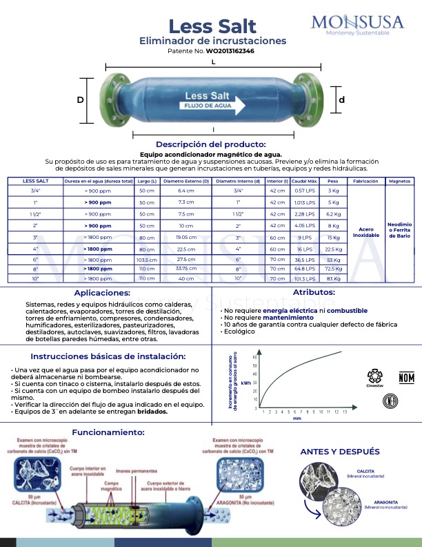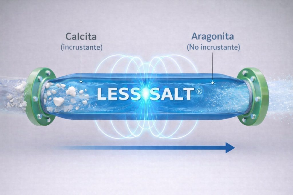 Less Salt es un equipo que transforma el tamaño y la morfología de las sales de Calcio y Magnesio. Las transforma de «Calcita» (capacidad incrustante) a «Aragonita» (capacidad no-incrustante).