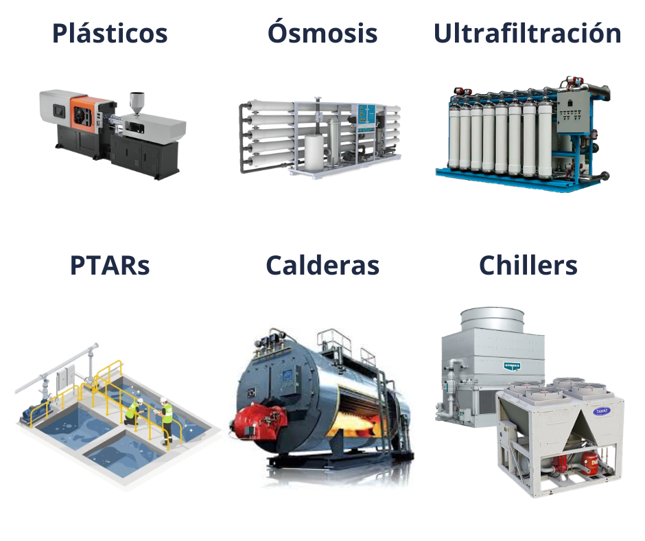 Aplicaciones industriales: Tuberías de procesos, torres de enfriamiento, chillers, pasteurizadores, calderas, ósmosis inversa, suavizadores de agua, UMAs, PTARs y más.