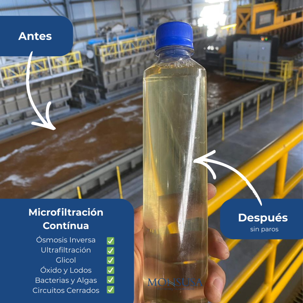 A través de una planta de microfiltración elimina de forma continua sólidos suspendidos, lodos y partículas finas del agua. Al hacerlo antes (pretratamiento) y durante la operación de otros procesos, protege los equipos, estabiliza la calidad del agua y reduce costos.